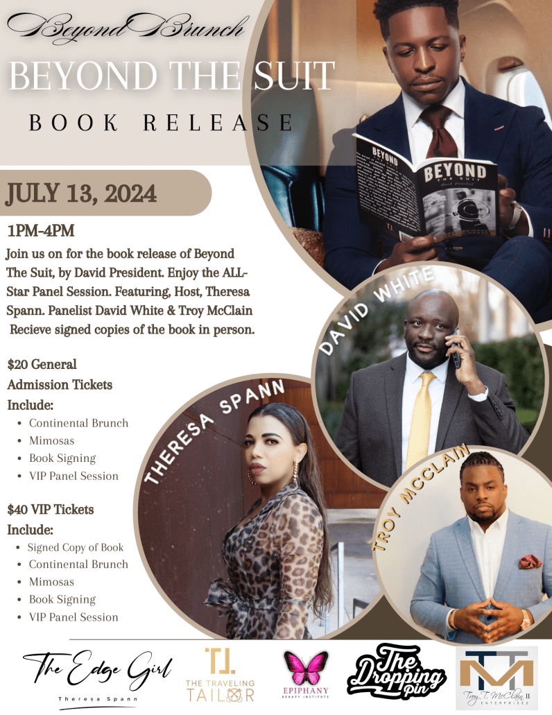 To celebrate the release of “Beyond The Suit,” President will host a book release party and signing on Saturday, July 13, in his hometown of Charleston, SC. The event will also feature a panel discussion moderated by Theresa Spann (The Edge Girl) alongside President and invited panelists Troy McClain Jr. (TMcClain Enterprises) and David White Jr. (The Dropping Pin). Prior to the panel, guests 21 and up will enjoy a continental brunch and cocktails. For more information, email thepresidentgroupllc@gmail.com or visit https://BeyondTheSuitBookSigning.eventbrite.com.